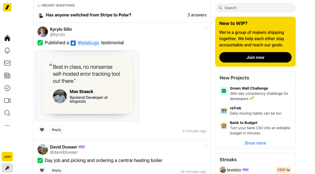 Entre sus usuarios destacan figuras como Pieter Levels (levels.io), creador de Nomad List y Remote OK, quien utiliza WIP para mostrar avances y conectar con otros fundadores que comparten su filosofía de construir sin depender de inversores.